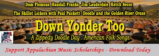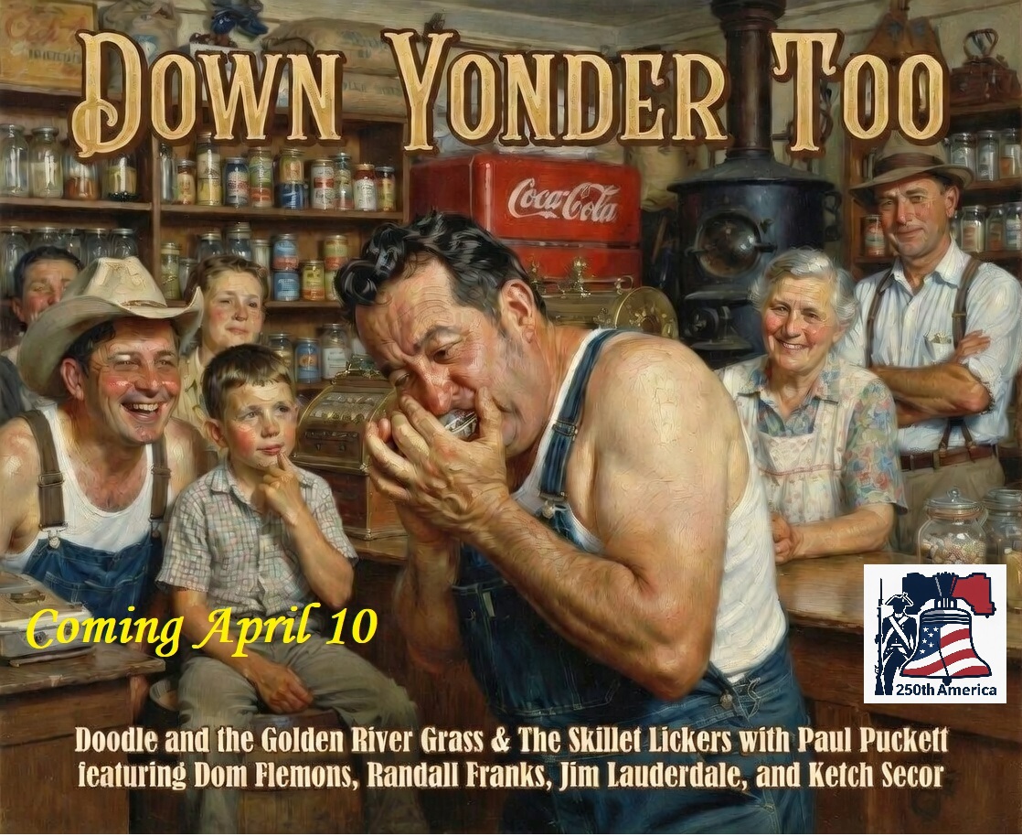 The uniqueness of the American Folk Songbook lies in its ability to incorporate tunes from every facet of the American experience and re-imagine them into new settings where the songs seem to have always been there. “Down Yonder” was a tune that permeated from fiddler to fiddler and musician to musician, starting as vaudeville number penned by Tin Pan Alley songwriter L. Wolfe Gilbert. It was introduced in 1921 at the Orpheum Theater in New Orleans and recorded early on with vocals by the Peerless Quartet and Ernest Hare & Billy Jones. It became an instrumental staple in the early fiddle bands of Appalachia and the South, such as the Scottdale String Band and Gid Tanner & His Skillet Lickers. Gordon Tanner’s 1934 performance with his father Gid and the Skillet Lickers became a million-seller, earning gold disc status and cementing the tune’s place in country music history. Ragtime pianist Del Wood gave it a newfound audience in 1951; her lively honky-tonk instrumental spent 25 weeks on the Billboard pop charts, peaking at #4, and sold over a million copies, earning her widespread fame and a long-running spot on the Grand Ole Opry. Bluegrass, folk, and country musicians continue to foster the tune, sharing it in recordings, jam sessions, and concerts to this day. Adding to its rich story for the Skillet Lickers Centennial, a fresh chapter unfolds with “Down Yonder Too”—a new version by Doodle and the Golden River Grass featuring The Skillet Lickers (with Paul Puckett), Dom Flemons, Randall Franks, Jim Lauderdale, and Ketch Secor. This collaborative recording includes brand-new lyrics penned by Franks and performed by Randall and Jim, blending the tune’s timeless spirit with contemporary voices to honor the legacy while raising funds for Appalachian music scholarships through the charity album A Zippedy Doodle Day : American Folk Songs.